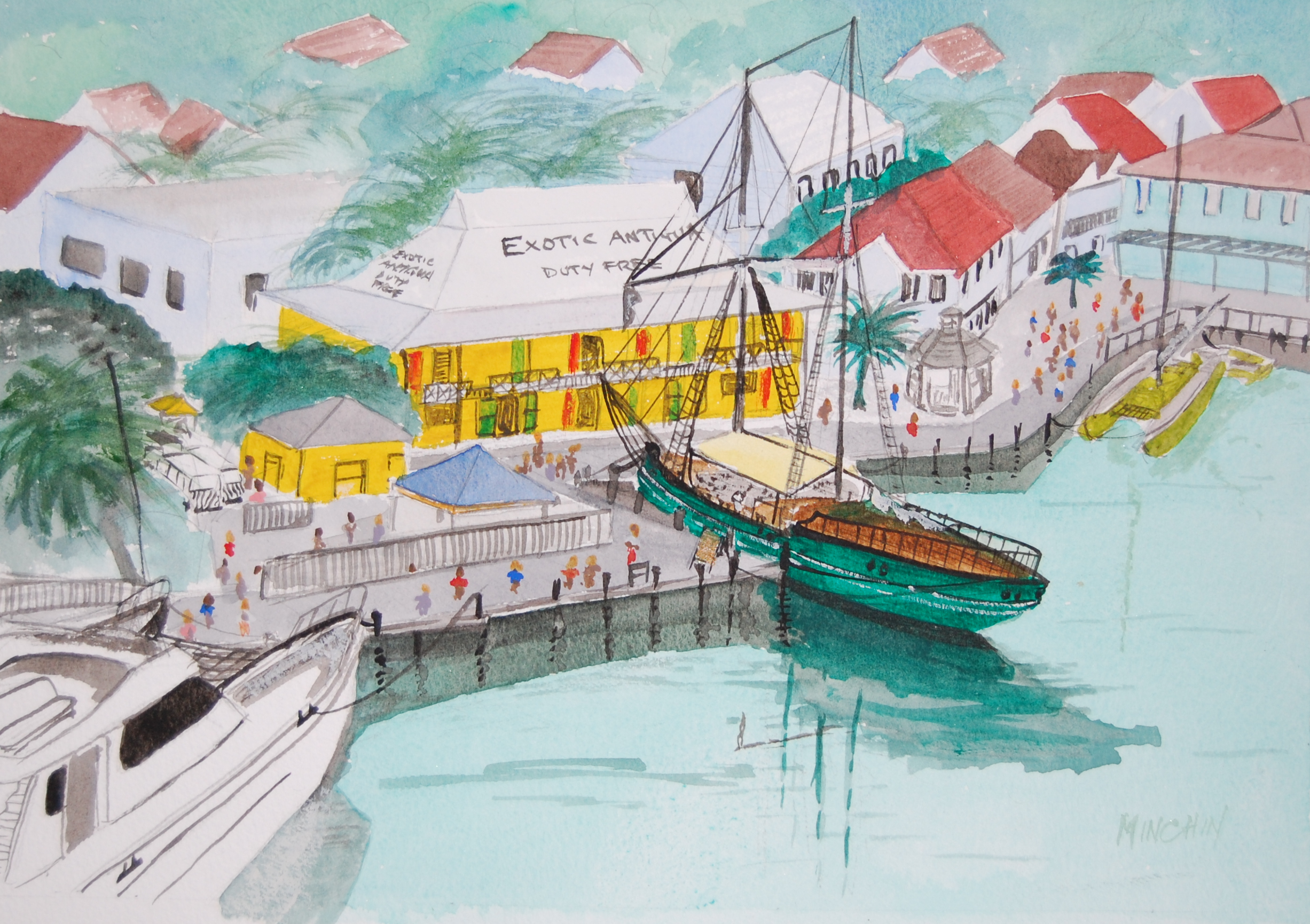 Painted during our first cruise around the Caribbean, the jetty at Antigua takes you straight from the ship into the vibrant heart of the town.