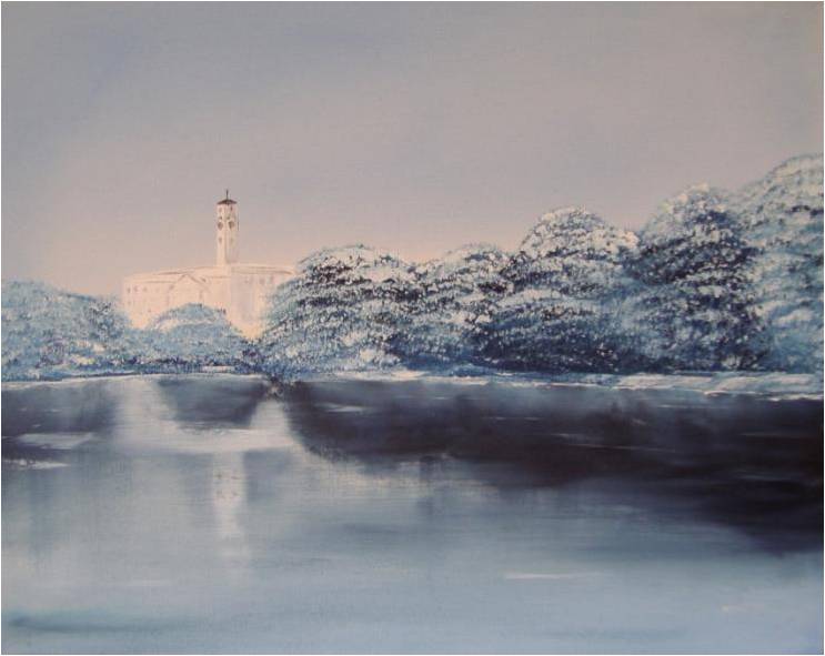 Although many of my paintings tend to be snowy scenes, this was in particular was deliberate as it was commissioned for the wedding invitations of my eldest daughter, who got married at the Trent building in December. There was no snow but the day after the wedding there was a hard frost which made for some excellent photos beside the lake.