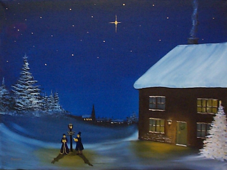 Midnight Carols Midnight CarolsOil on Canvas16″ x 20″Painted 2007 Unframed, £29 + Delivery One of my 2007 Christmas Card collection (yes, I turned these pieces into the front cover of our annual Christmas cards). Related