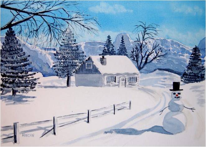 Snowman Lodge Snowman LodgeWatercolour10″ x 14″Painted 2009 Mounted, £29 + Delivery Part of our 2009 Christmas card collection. Related